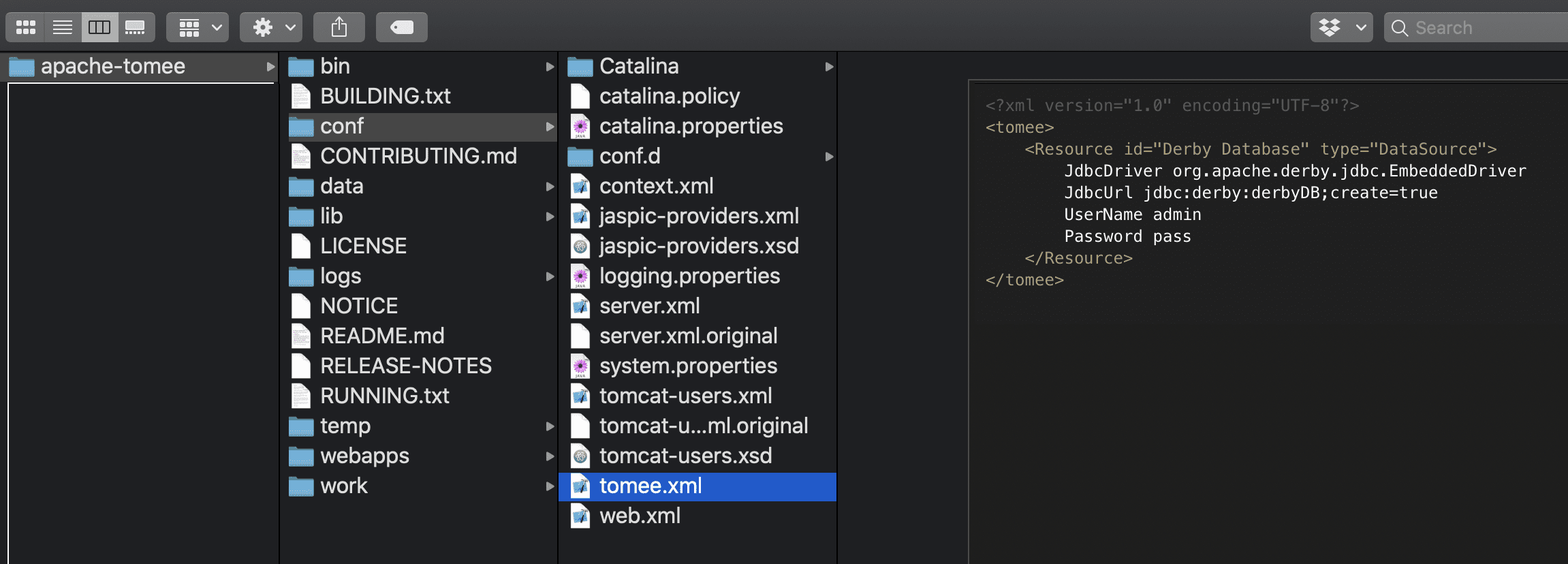 As you can see, configuring a JDBC driver for use in TomEE really is not that complicated. All you need to know are the properties the driver requires and then to decide if you want the JDBC driver configured across the entire server or only for a specific webapp.