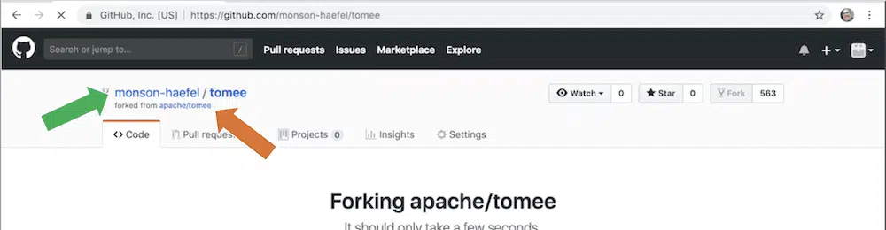 The green arrow points to your copy of the TomEE open source project and the orange arrow points to the source of that copy; the original Apache TomEE project. You’ll always see this at the top of your TomEE repository which tells people where you got the code from and provides a convenient link to get back to the original project.