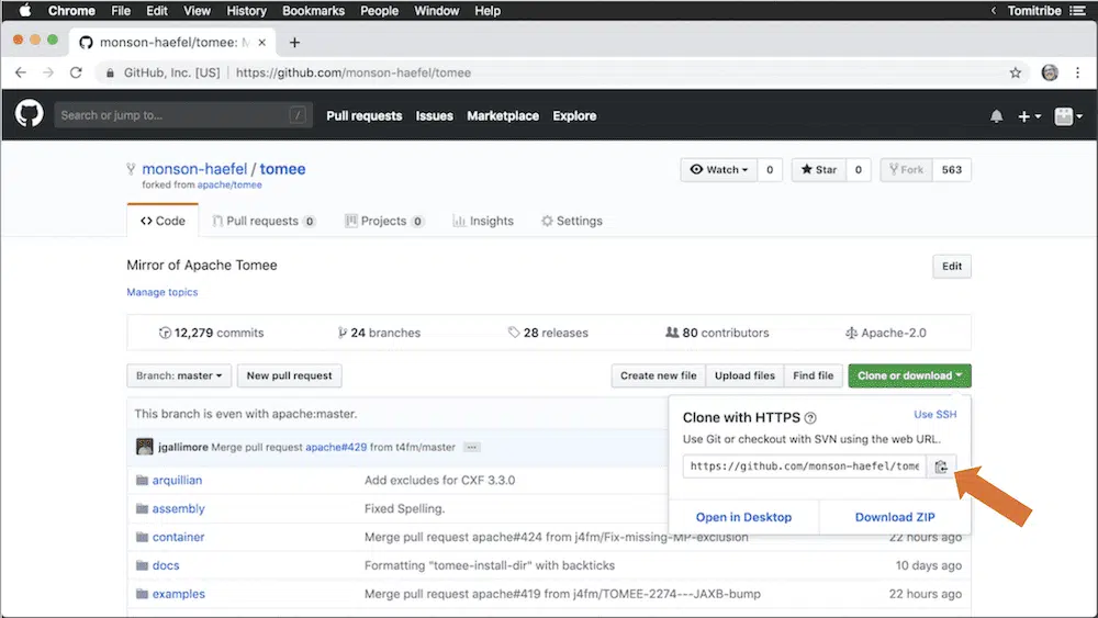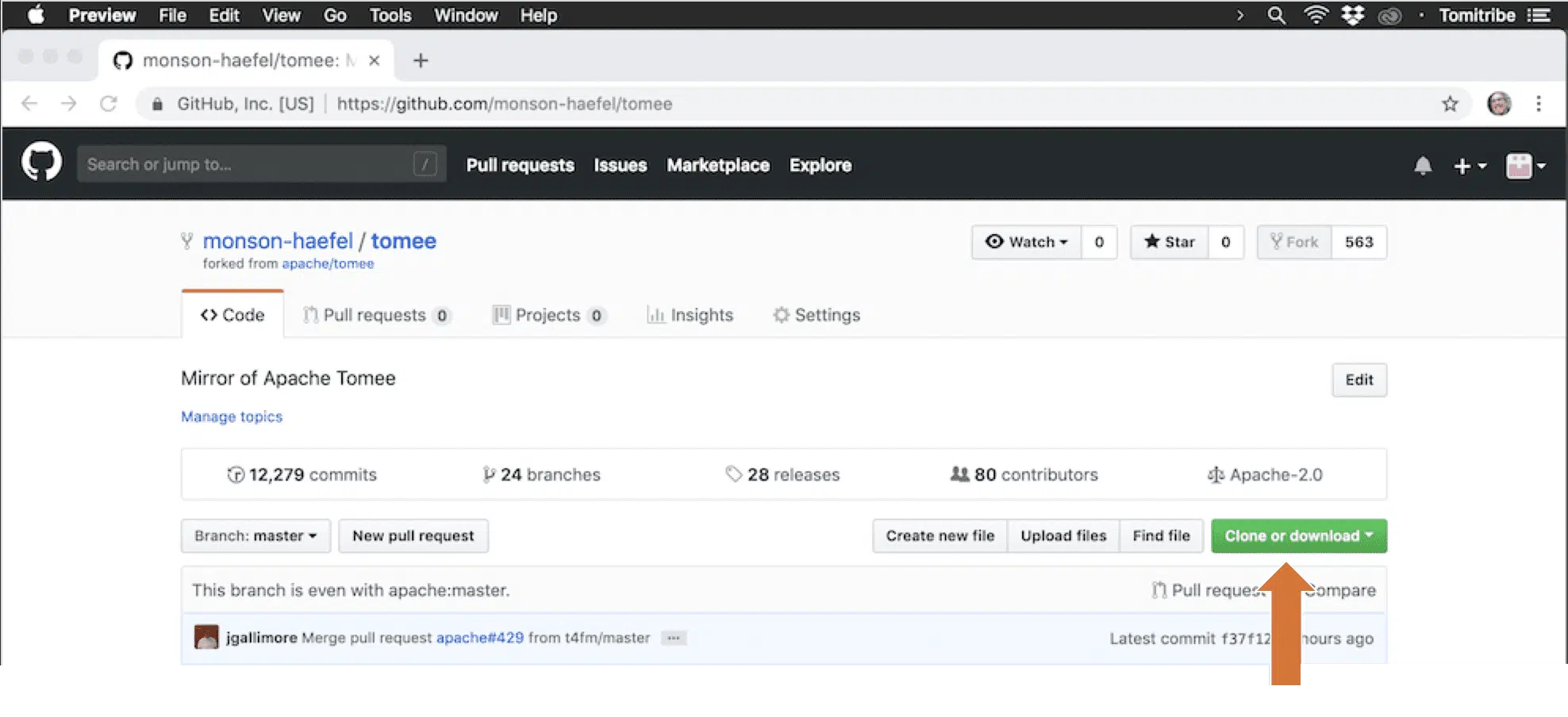 On the upper right-hand corner is the “Fork” button which will make a copy of all the TomEE files and put them into your own personal repository.