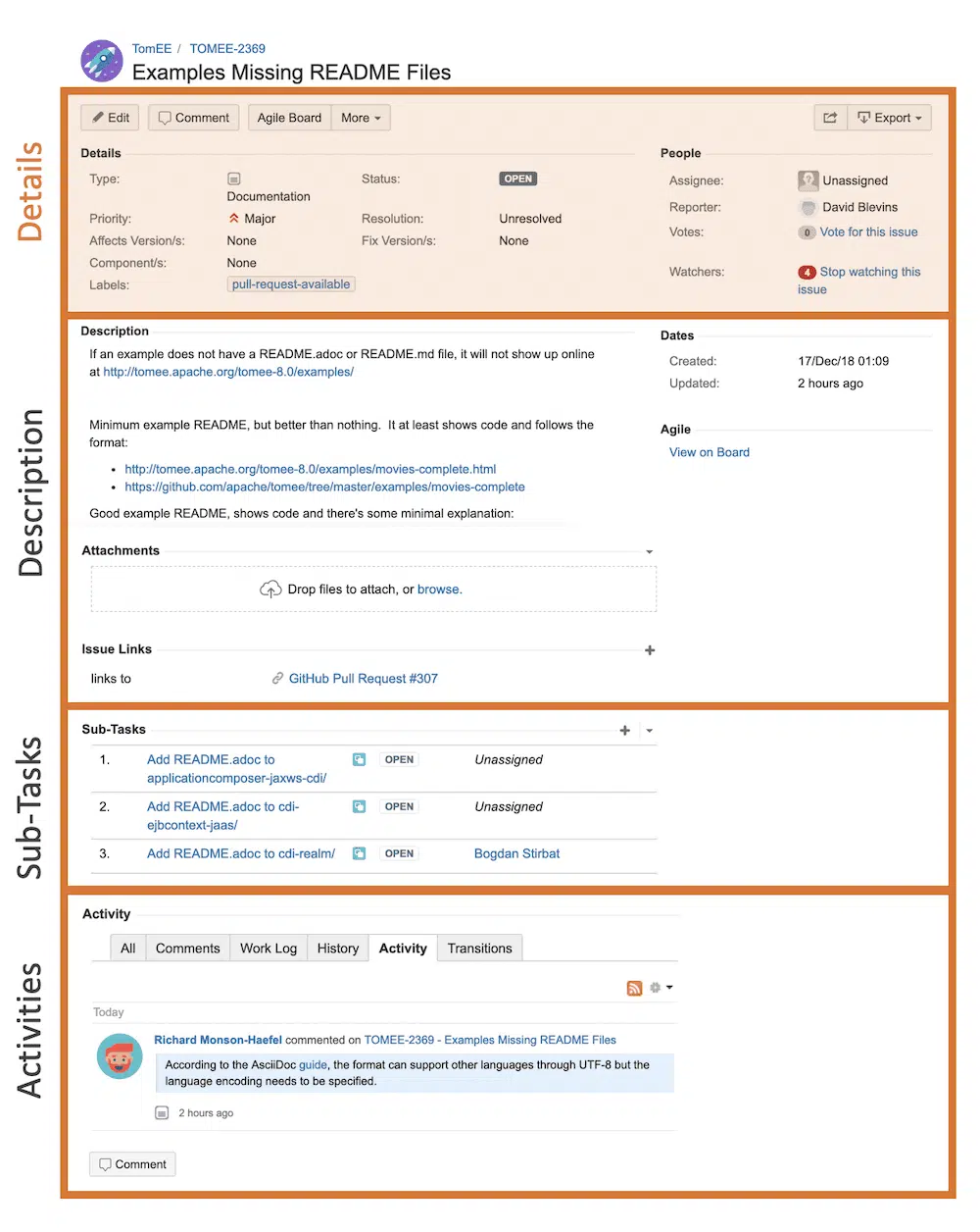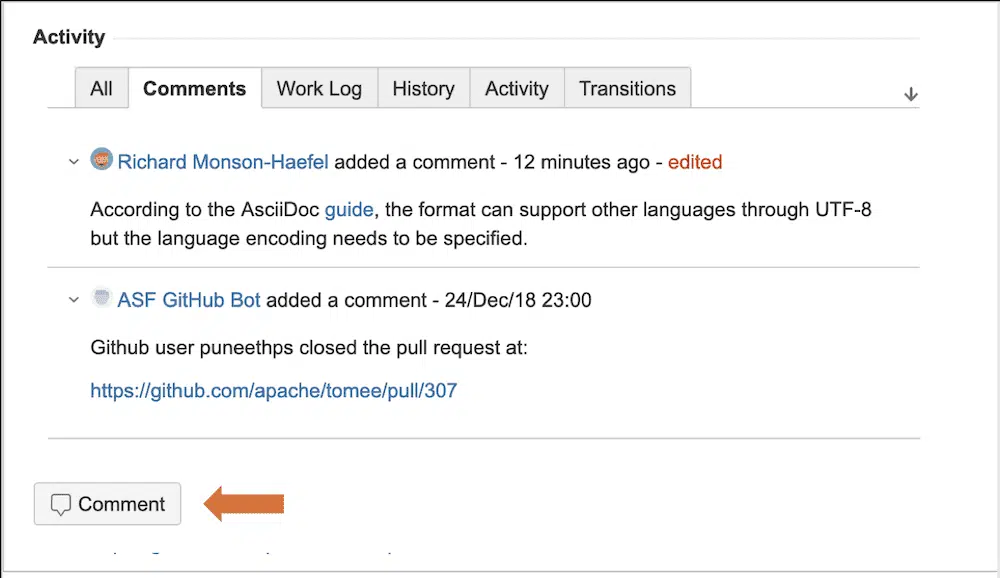 The Activities section serves several purposes but the TomEE project only takes advantage of a couple of them, namely: “Comments”, “History”, and “Activity”.