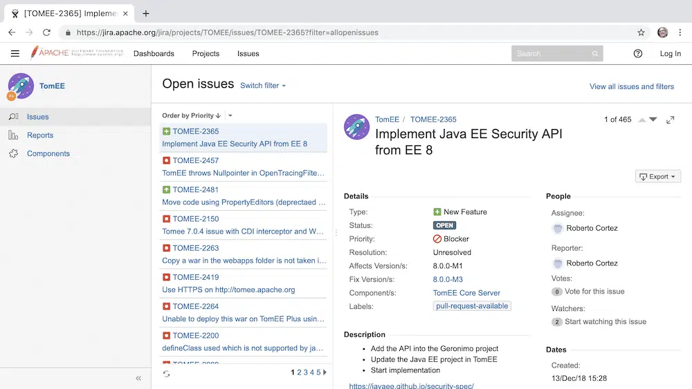 When you join the TomEE community you will end up using JIRA a lot and you’ll find it very useful, but it may seem a little bit intimidating at first. There is a lot of information and fields on a JIRA issue. No worries! This article will explain all those fields and their meaning.