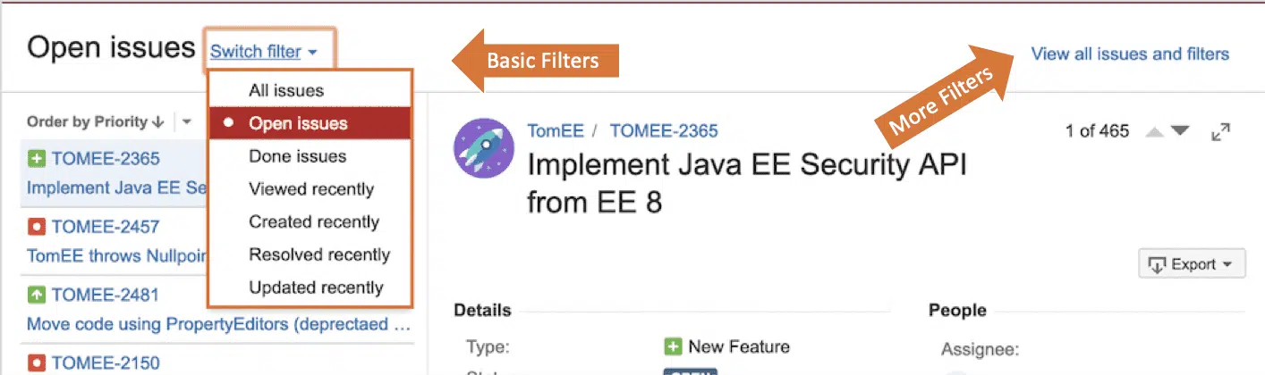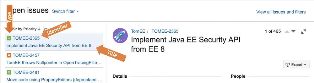 Every Issue that is filed in JIRA has a unique identifier that has two parts, the project identifier (e.g. “TOMEE”) and a 4 digit issue number unique within our project. You will usually refer to issues by their identifier (e.g. “TOMEE-2365”). The issue identifier is shown on every issue listed (see the orange arrow labeled “Identifier”).