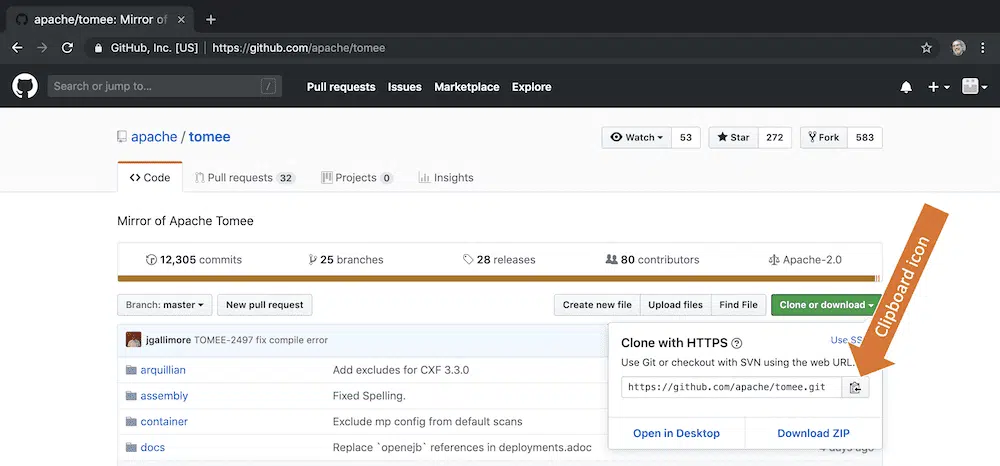 Once you are at the Apache TomEE GitHub page click on the green “Clone or download” button to get the repository’s unique URL. After you click on the green button click on the icon of a clipboard next to the URL shown in the dropdown box (see below). That will copy the URL to your clipboard.