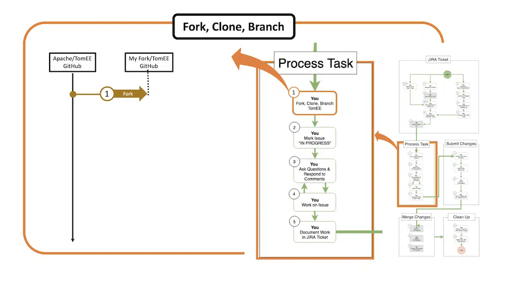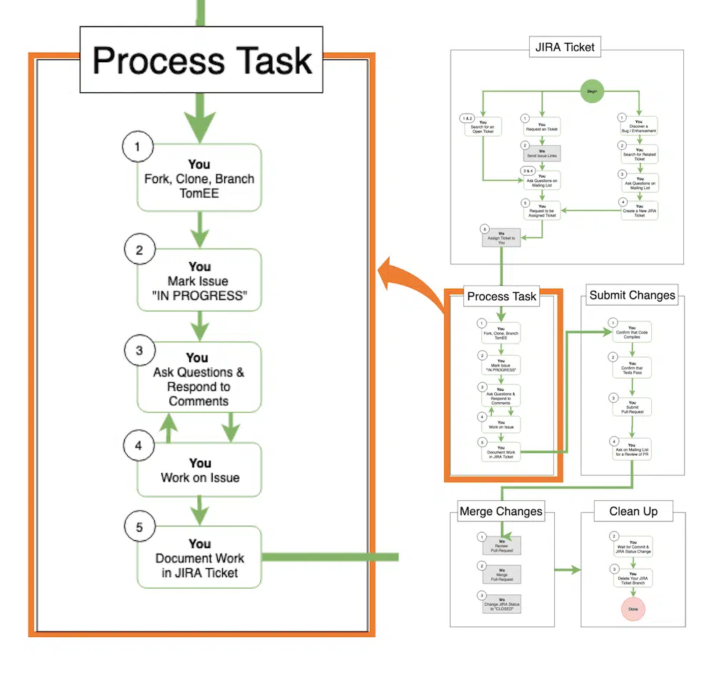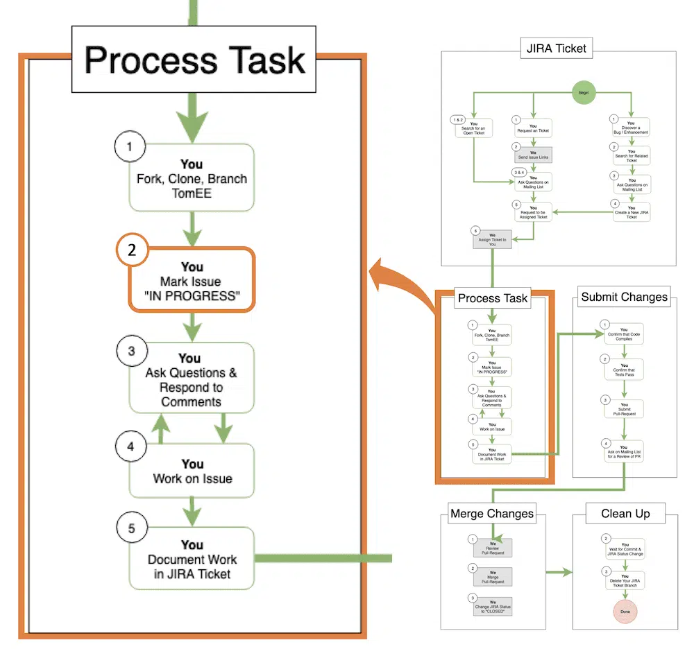 TomEE has a process called the Contribution Workflow that we follow to ensure that everyone is on the same page and that everything is clear and open. The Contribution Workflow includes five sub-processes: JIRA Ticket, Process Task, Submit Changes, Merge Changes and Clean up.