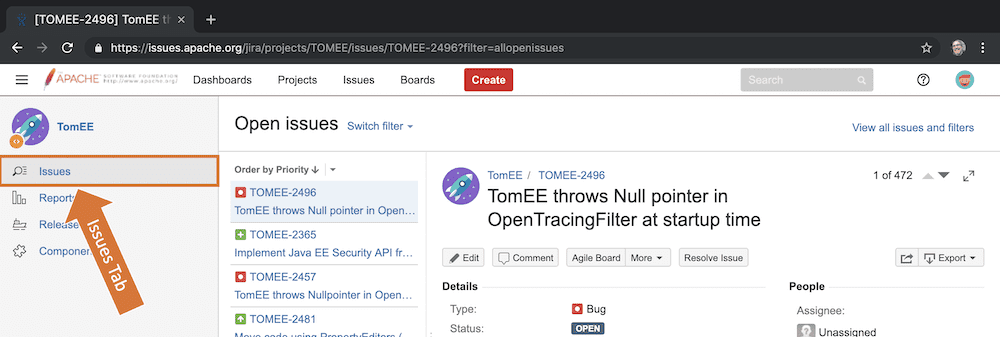 After logging in to TomEE JIRA instance select the “Issues” tab (see orange arrow above) if it’s not already selected by default. Once you are there you can look at all of the JIRA Tickets assigned to you by clicking the “Switch filter” dropdown box and then selecting “My open Issues” menu item as shown below.